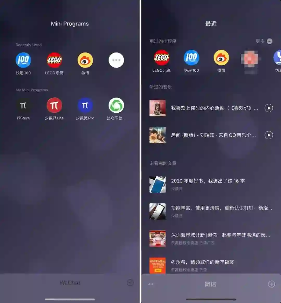 主界面下拉的「小程序」页面变为「最近」页面,新增最近播放的音乐、视频,读过的文章等内容。原先的「我的小程序」被收进了右上角的「更多」菜单。
