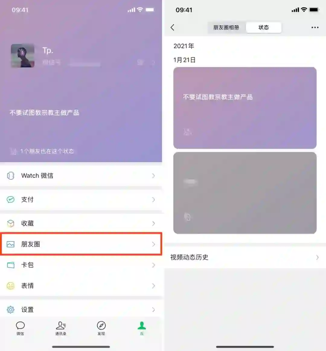 随着「我的状态」的上线,原先占用资料背景的「视频动态」功能则被移除了。你可以在「我 - 朋友圈 - 状态」中找到先前发布过的视频动态,但无法发布新的视频动态。