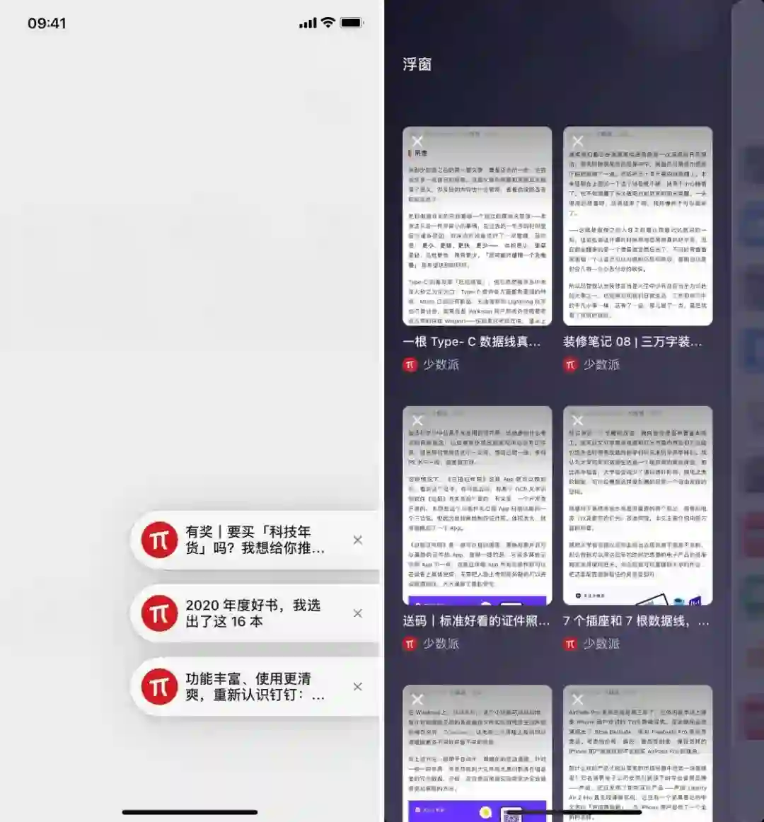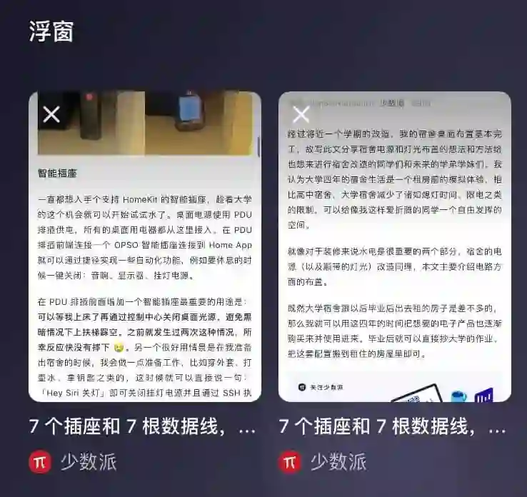 正是由于这样的改动,你完全可以将新的浮窗界面当成一个简易的公众号稍后读工具:遇到感兴趣的文章直接放进浮窗,到了「稍后读」时间再把它们读完。有趣的是,你可以为同一篇文章创建多个浮窗,变相实现「书签」功能。