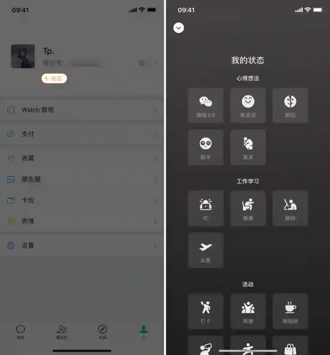 微信 8.0 新增了「我的状态」功能,你可以将自己当前的状态记录下来,并且展示给你的朋友们。你只需要在「我」中点击微信号下方的「+ 状态」即可添加当前的状态。此功能目前正在逐渐开放给全部用户,部分用户可能暂时无法访问。