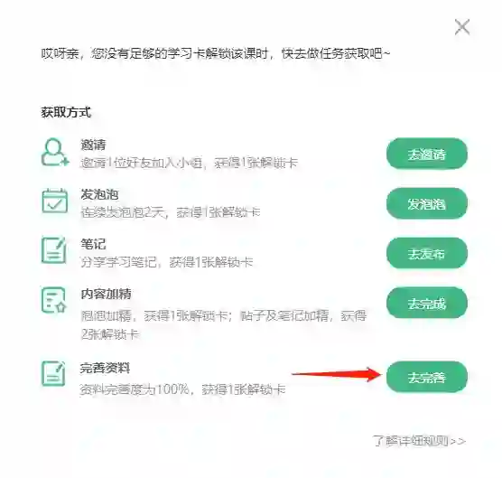 将个人资料填写至完善度 100%,然后点击提交按钮,即可获得解锁卡一张。