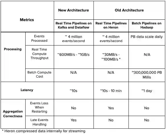 下面是两个架构之间的指标比较表。与旧架构中的 Heron 拓扑相比,新架构具有更低的延迟、更高的吞吐量。此外,新架构还能处理延迟事件计数,在进行实时聚合时不会丢失事件。此外,新架构中没有批处理组件,所以它简化了设计,降低了旧架构中存在的计算成本。