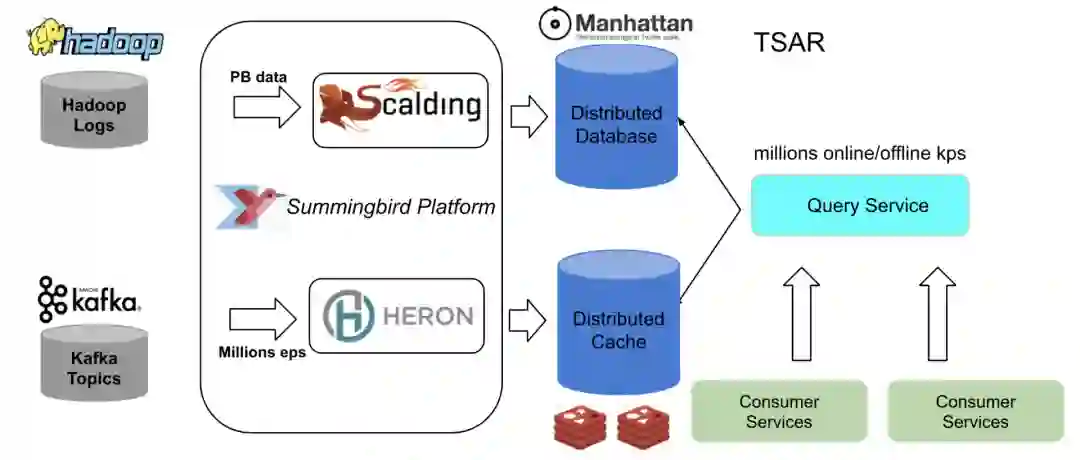 实时数据存储在 Twitter Nighthawk 分布式缓存中,而批处理数据存储在 Manhattan 分布式存储系统中。我们有一个查询服务,可以在这两个存储中存取实时数据,而客户服务则会使用这些数据。