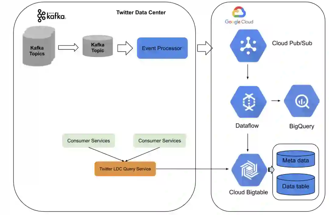 新架构基于 Twitter 数据中心服务和谷歌云平台。我们在内部构建了预处理和中继事件处理,将 Kafka 主题事件转换为具有至少一个语义的 pubsub 主题事件。在谷歌云上,我们使用流数据流作业,对重复数据进行处理,然后进行实时聚合并将数据汇入 BigTable。