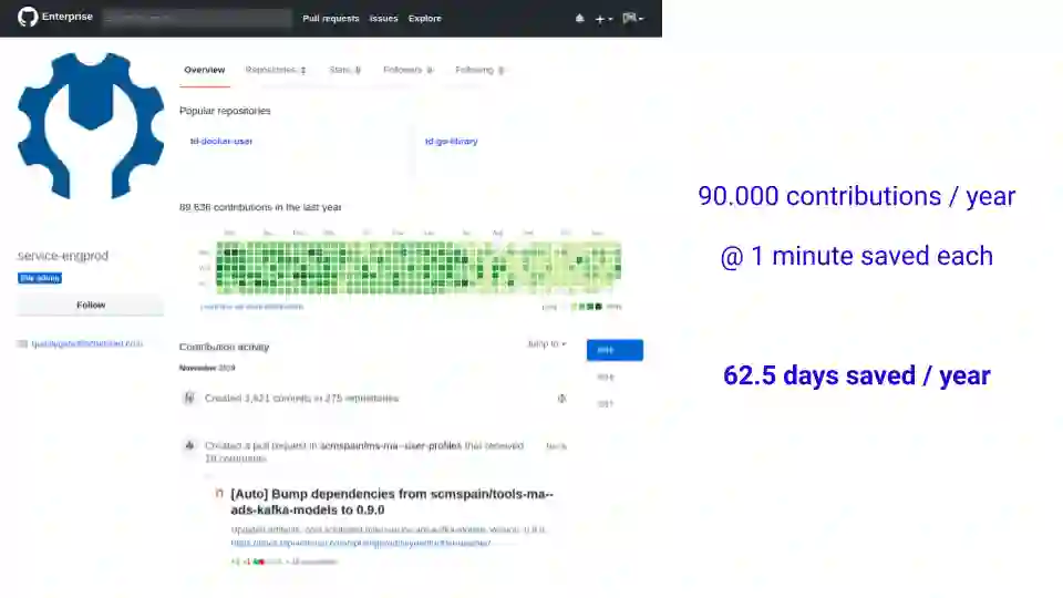 上图是服务用户的配置文件,其在我们内部的 GitHub Enterprise 实例中执行所有这些动作。假设每个动作的价值为 1 分钟(实际上很多动作节省的时间更久),一年下来就能节省 62 个工程师工作日。这种影响可以很容易地转化为金钱,转化为其他业务可以理解的术语。