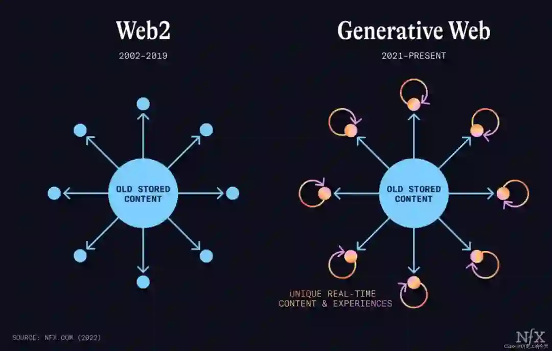 时至今日,互联网的特点还是以前的那一套:也就是先通过数据库查询,获取存储的旧内容,再从中心传递给处于信息网络边缘的个体。生成式技术会改变互联网现有的拓扑结构,因为它会先让独特性的内容在信息网络边缘生成,再通过个体的行为完成最终实现。