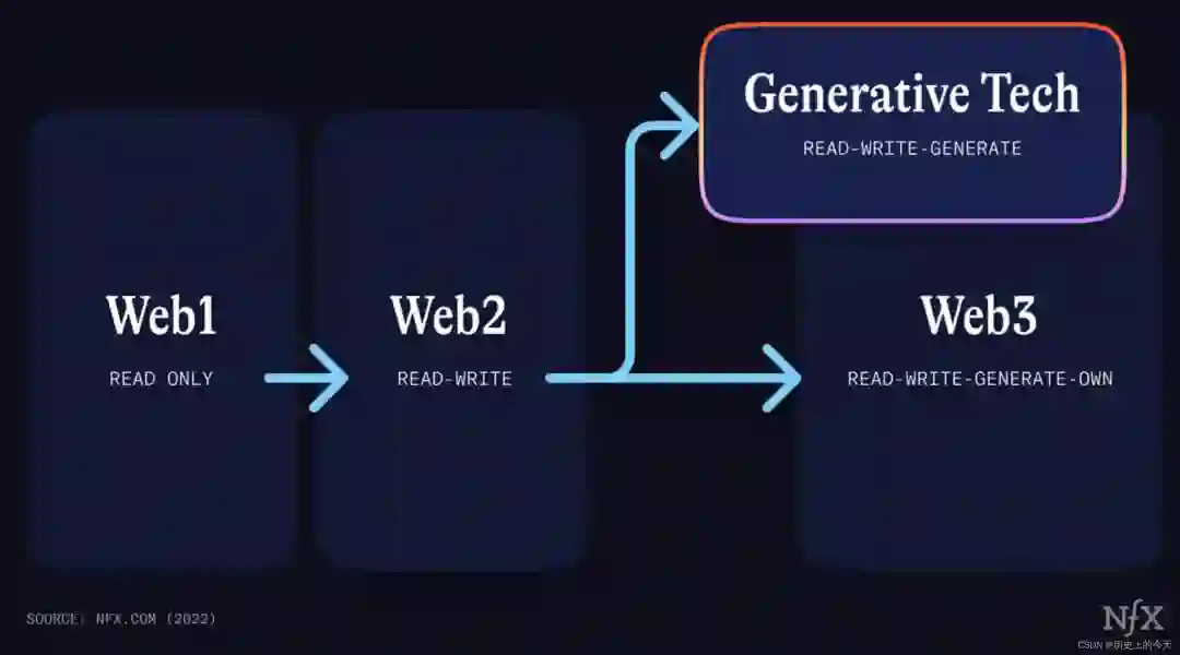 这是一个重大转变,能为初创公司带来无限的机会。如果说 Web1 是“只读”的、Web2 是“读写”的、生成式技术是“读-写-生成”的,那么 Web3 就是“读-写-生成-自有”的。生成式技术如今在与 Web3 并行发生,并且发展得十分迅速。