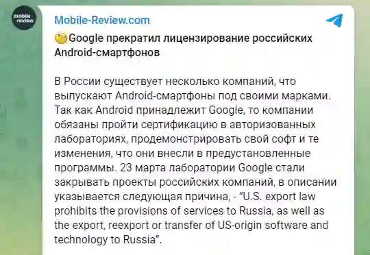 结果,真如墨菲定律的“怕什么来什么”,3 月 24 日 Mobile Research Group 首席分析师 Eldar Murtazin 在 Telegram 上表示:“3 月 23 日,谷歌已经开始拒绝所有俄罗斯公司的认证项目,原因是:美国出口法禁止向俄罗斯提供服务,以及向俄罗斯出口、再出口或转让源自美国的软件和技术。”