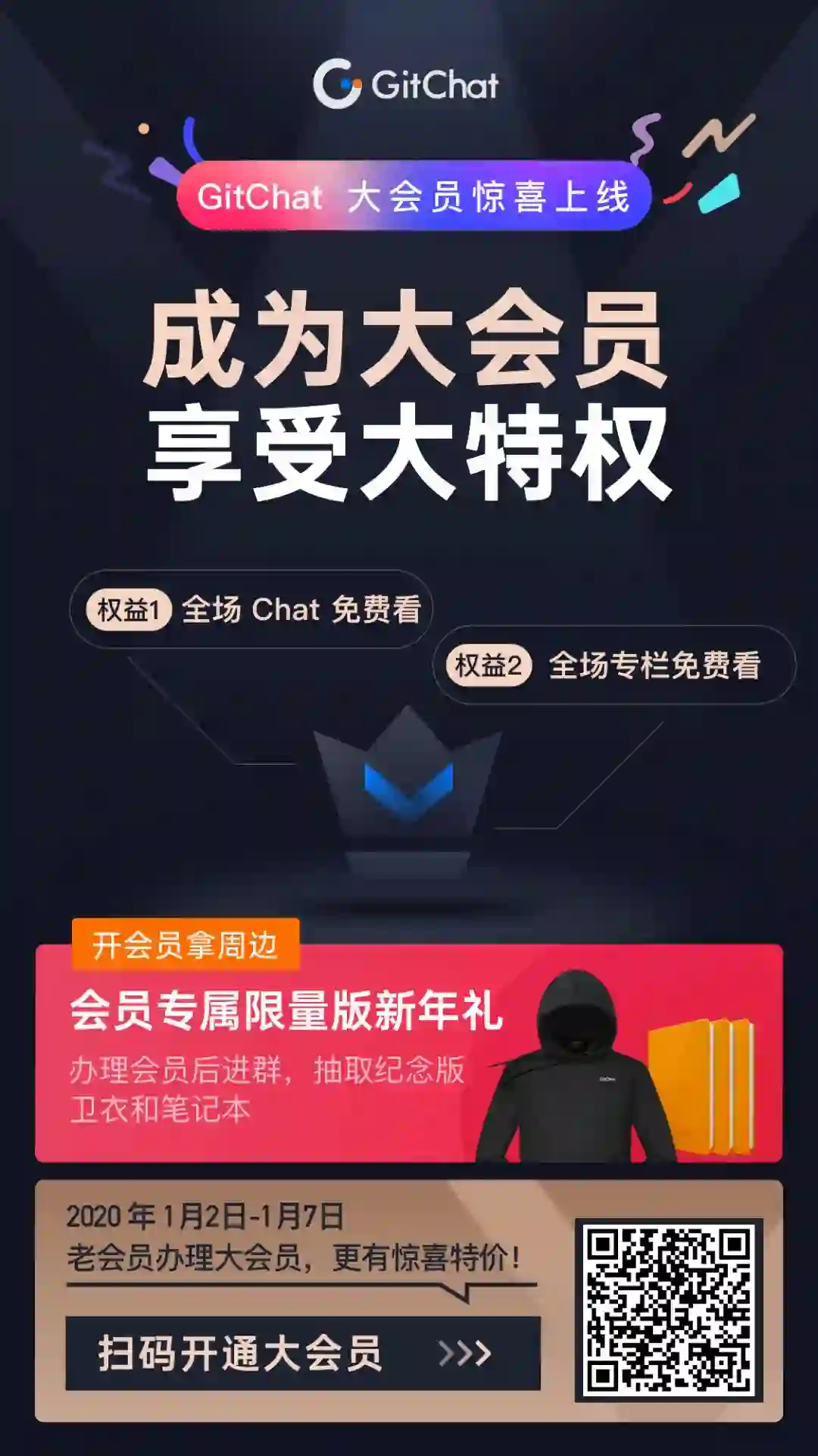 无论你现在是 Chat 会员、超级会员、精英会员,还是你曾经是任何一种 GitChat 会员,在 2020 年 1 月 2 日到 2020 年 1 月 7 日期间,你都可以用超值的续费价格成为 GitChat 大会员,享受大会员特权。