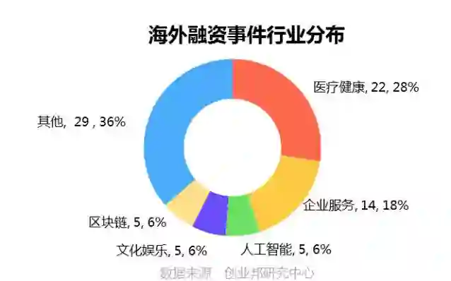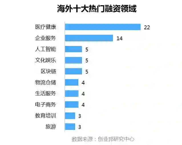 本周披露国外融资事件涉及18个行业领域,其中融资案例数最多的五大行业分别是医疗健康22起,企业服务14起,人工智能、文化娱乐、区块链并列5起