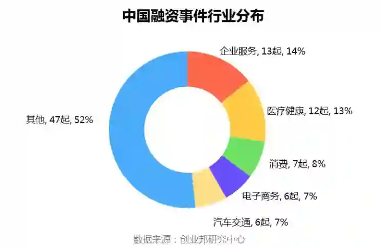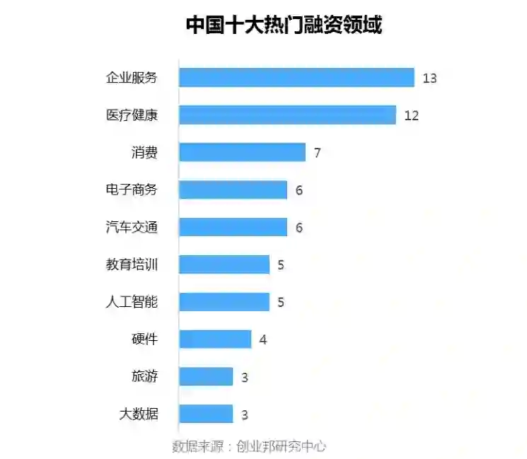 本周披露融资事件涉及25个行业领域,其中融资案例数最多的五大行业分别是:企业服务13起,医疗健康12,消费7起,电子商务、汽车交通并列6起。