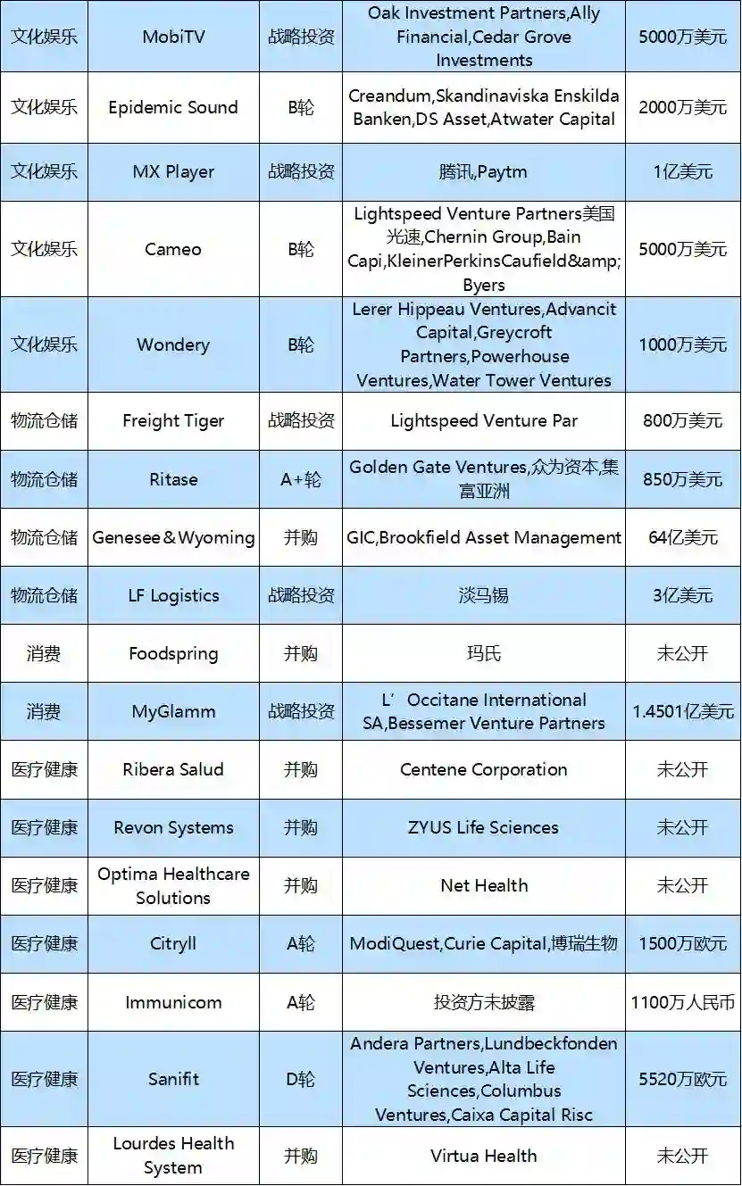 本周国外的投融资事件主要医疗健康,企业服务,文化娱乐等领域。以下为本周值得关注的投融资事件: