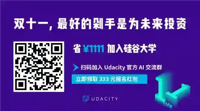Udacity 还非常本地化的推出了双十一活动,11.1-11.11期间报名最高可享 ¥1111 优惠,席位有限、抢完即止如果你是也是 AI 热爱者,欢迎扫码以下二维码加入 Udacity 官方 AI 交流群,获得来自硅谷的深度学习/机器学习就业指南,还可以领取 333 元无门槛红包,与其它双十一优惠叠加使用。