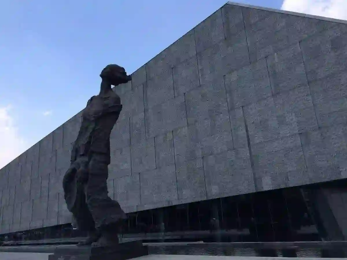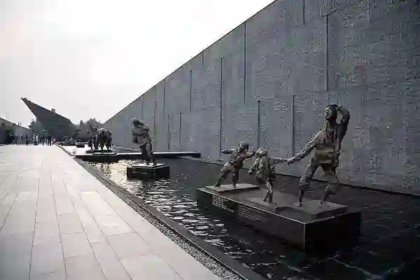 侵华日军南京大屠杀遇难同胞纪念馆。去过的人都知道,那里面非常安静。讶异,哀痛和耻辱感混合在一起,压抑了一切欢笑,喑哑了一切言语,唯有眼前烛光闪闪,心里警钟长鸣。灰色的建筑下是浅浅的水池,倒映着几个扭曲的影子。雕塑颜色单一,但是你仿佛能在皴裂的肌肤上看见鲜血。雕塑本身发不出声音,你却能感觉到耳边的嘶喊与哭泣。