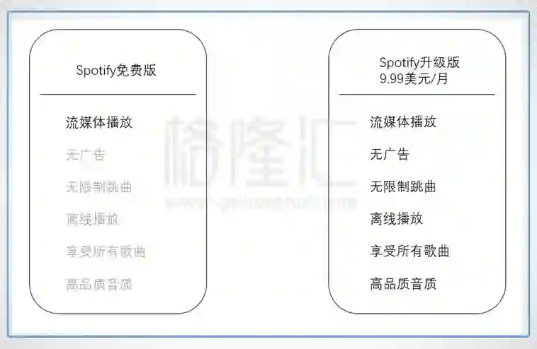 图:Spotify不仅为付费会员提供音乐服务,免费听众同样能在平台上听歌,只不过,9.99美元的月费能让你享受更多的服务。