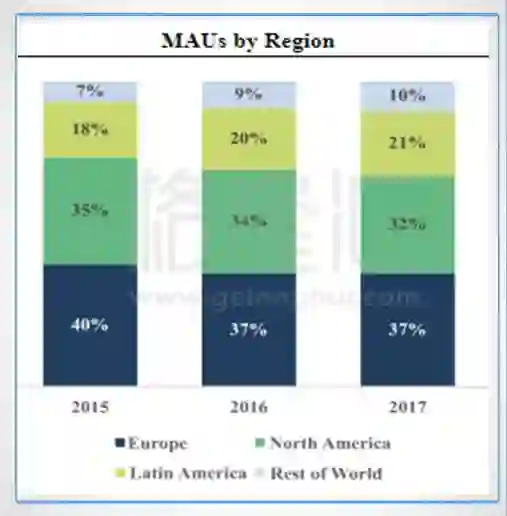 Spotify已进入61个国家,可分为四大区域:欧洲、北美、拉丁美洲和其他地区。其中,欧洲作为Spotify 的大本营,拥有5800万用户,贡献了最多的用户数量,其次是北美市场。但新兴市场的增长潜力显然更大,拉丁美洲去年月活增长了37%,其他地区用户增长了51%。