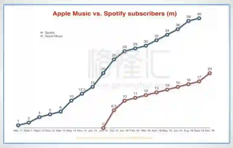 2013年,推出12年的iTunes数字音乐商店首度出现销量下滑,美国区数字唱片集下载销售较年初下降13%,数字音轨下载销售较去年下降11%,而以Spotify、Pandora、YouTube为代表的流媒体平台开始崛起。Spotify从0到100万付费用户,用了3年时间,从100万到2000万用户用了四年时间。此时,苹果的流媒体服务才刚刚起步,后知后觉的苹果2015年推出apple music服务,虽然占尽了品牌和平台优势,也难以追赶已经打磨了7年的Spotify。