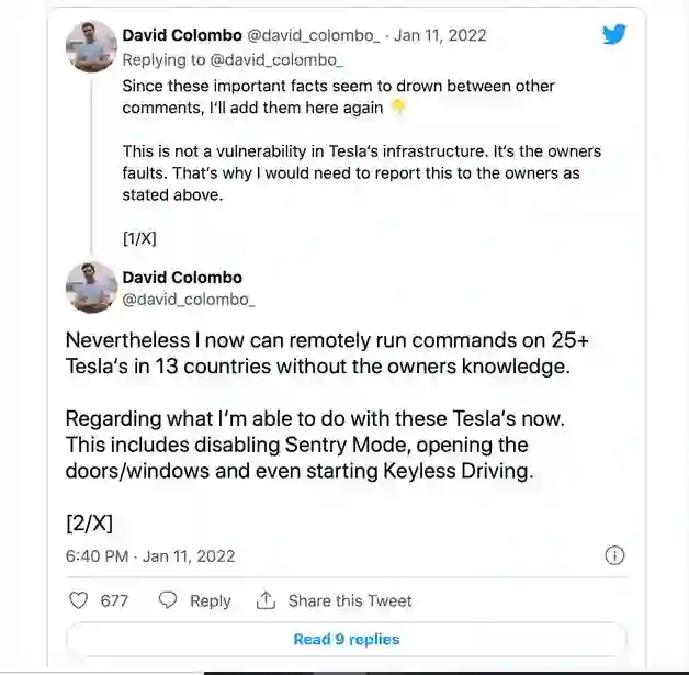 David Colombo后来在Twitter表示,他已经与特斯拉的安全团队取得了联系,并且他表示特斯拉的安全团队正在调查这个问题,该团队会向他反馈最新信息。