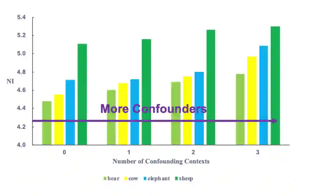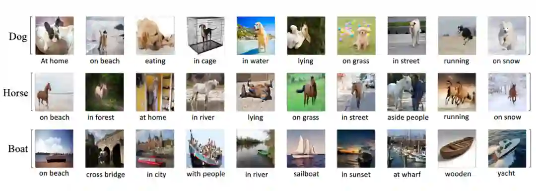 选择NICO的上下文的时候,我们特别注意收集搜索引擎上与主体对象出现频率最高的联想词,这样可以保证每个(主体对象,上下文)都能收集到足够多的数据样本,保持数据集的规模,适应不同的实验设定。