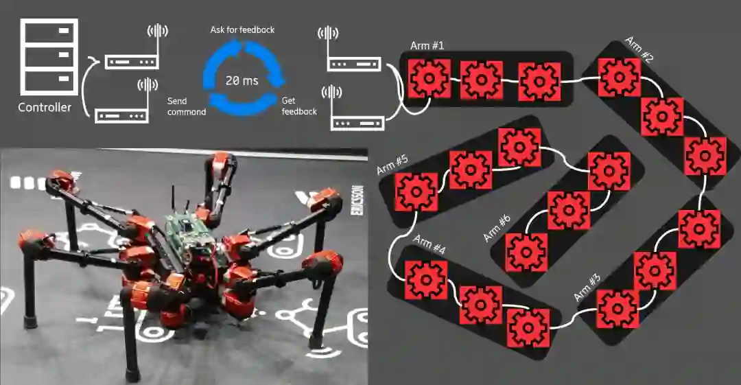 这台“蜘蛛侠”机器人不仅可以前进和后退,还能跟随音乐跳舞。它由6个单独的机械臂组成,通过5G网络和边缘云的部署,机器人的6条腿之间可以保持实时沟通,从而协同完成每一个动作。