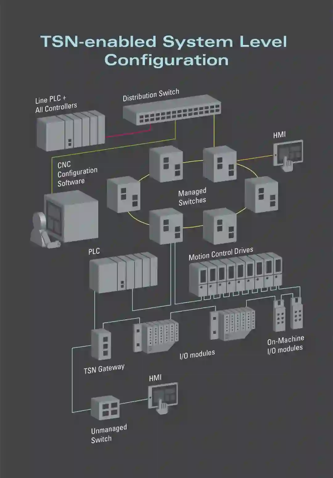 TSN让网络的配置和部署更加简便,它向用户提供系统视图,配置I/O和控制设备。TSN的核心原则是使用一张网络管理所有通信,以保证性能和数据传输。