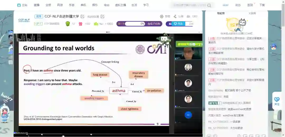 在本次报告会上,专家们围绕《文本情感分析、理解与生成》、《知识与预训练模型》、《多模态神经机器翻译:建构细粒度的多语言-图像特征符号奠基》等NLP热门话题展开了精彩报告。活动通过AI研习社和Bilibili等平台线上直播观看的方式进行,同学们互动踊跃。