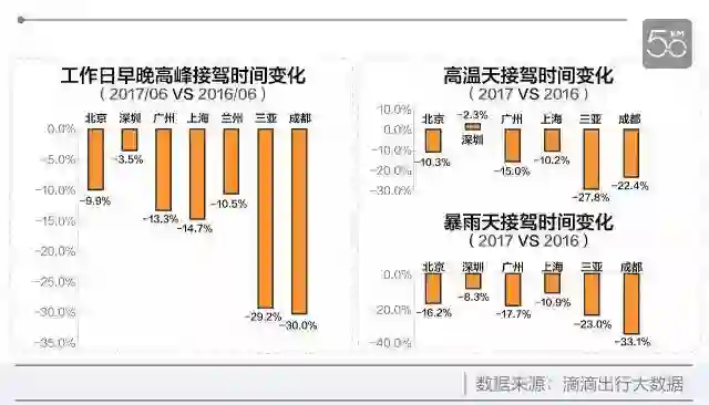 滴滴出行大数据显示,对比2016年,滴滴接驾平台运营效率整体均有明显提升。通过“接驾时间”变化可以看出,无论是在通勤时间段还是高温和暴雨天,在几个核心城市,滴滴出行平台的运营效率均有大幅提升。