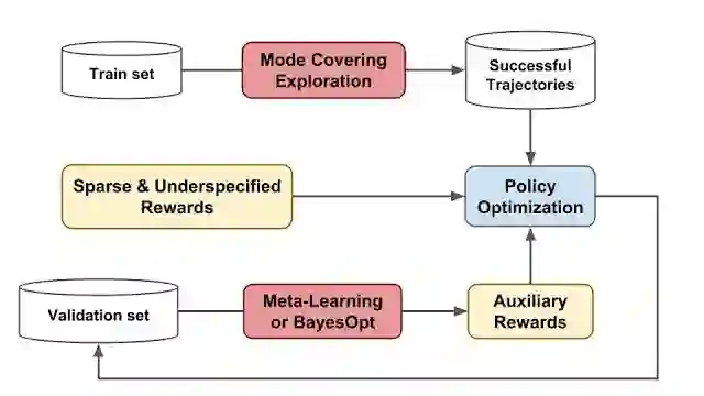本文方法概述。我们采用(1)涵盖探索的模式,在内存缓冲区中收集一组不同的成功轨迹;(2)采用元学习或贝叶斯优化,以学习辅助奖励,为策略优化提供更精确的反馈。