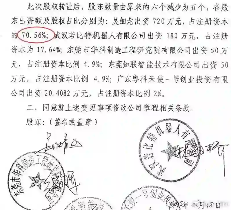 作为投资人,吴细龙提出了几个要求,首先是不想投资周伟团队原有的公司,而是希望将平衡车项目单独拿出来成立一个新的公司,他投资500万,控股60%,任董事长及法定代表人,周伟任公司总经理,任期为3年。武汉若比特机器人有限公司以技术入股,合作的相关项目知识产权归新公司;其次,公司要在东莞注册。