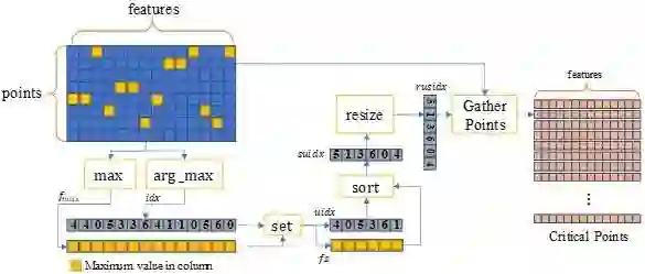 关键点(Critical Points)的选取以及关键点层的形成简单高效。与大多数基于图(Graph-based)的点云降采样方法不同,该方法并不使用k-NN寻找每个点的最近邻,而只需在全局范围找到关键点即可,因此效率极高。