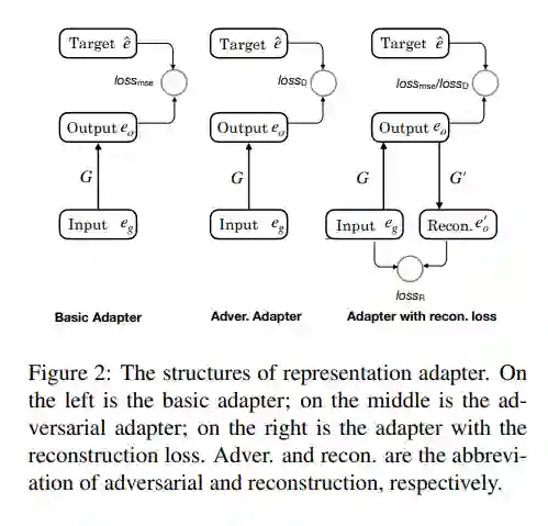 我们的 Adapter 采用一层线性神经网络将关系表示从通用的表示空间,映射到任务特定的表示空间。通用空间的表示通过一些无监督的算法在知识库层面训练得到,任务特定空间具有的表示通过具体的下游任务训练得到。我们提出的 Adapter 与简单增加网络层数不同的一点在于,我们使用特殊设计的损失函数来优化这一映射,而不是简单的将其作为下游任务网络的一部分进行优化,实验部分我们会比较这一点的。损失函数可以使用任何评价两个表示相似程度的指标。对于基本 Adapter(Basic Adapter) 我们使用均方误差来优化这一映射。我们也提出了使用对抗损失来优化 Adapter 的参数。注意到上述两种方法均只能利用已登录关系的表示,而忽视了未登录关系所具有的有效信息,我们增加一个反向 Adapter 将正向 Adapter 得到的表示映射回通用表示空间。