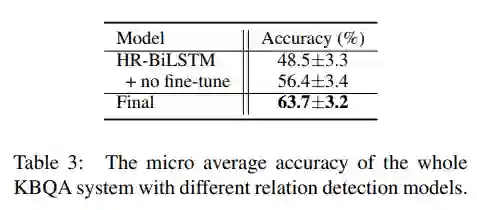 可以看出,我们的模型可以显著的提高知识库问答的精度。和之前的结果对比,我们发现确实是关系检测性能的提升导致知识库问答的提升。