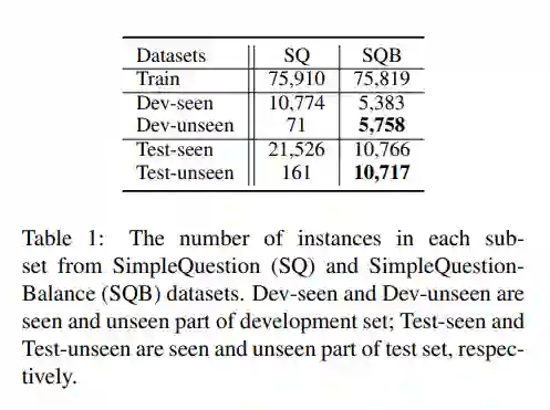由于 SimpleQuestion 不能很好的评估未登录关系检测,我们重新组织了 SimpleQuestion 的训练,开发,测试集,得到新的数据集 SimpleQuestion-Balance(SQB)。新数据集的开发集和测试集中已登录和未登录关系的比例大致相当。同时,我们也保持了和原有 SimpleQuestion 相同的数据集划分比例。