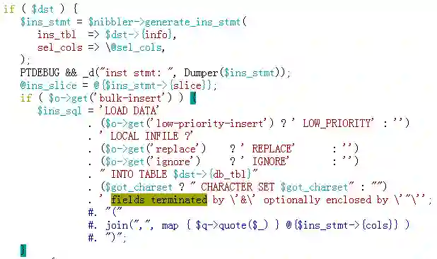 4、--bulk-insert批量插入是在远程机器以Load data方式插入的,因此要添加FIELDS TERMINATED字段分隔符。