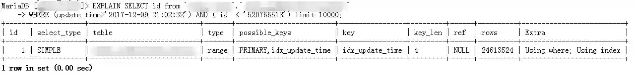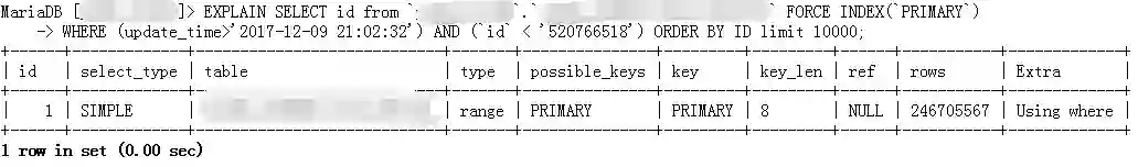 说明:因为我这边是以update_time为抽取条件,默认情况下pt-archiver生成的SQL会强制扫描主键id并对主键排序,如下面的语句: