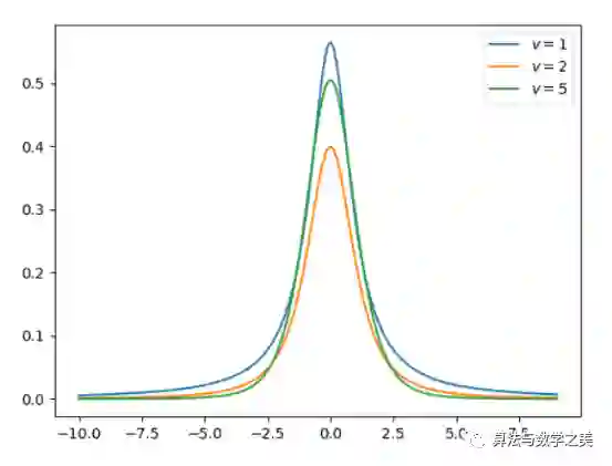 t 分布也是对称的倒钟型分布,就如同正态分布一样,但它的长尾占比更多,这意味着 t 分布更容易产生远离均值的样本。