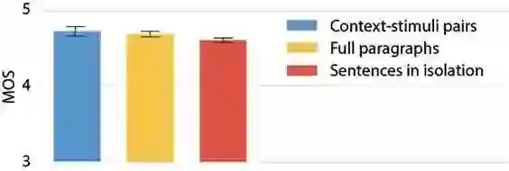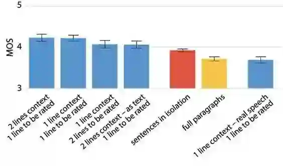 随着未来 5G 移动互联网网络的飞速发展,语音交互将有可能取代键盘和触摸成为语音输入的主导方式。但生成的语音是否逼真自然,又如何进行评价呢?传统的评价方法往往局限于单独语句,而无法对整段生成语音的效果进行全面系统的评价。近日,谷歌研究人员对评价多行文本生成语音的几种方法做了对比,并给出了不同语音呈现方法下的平均意见得分(MOS)结果。