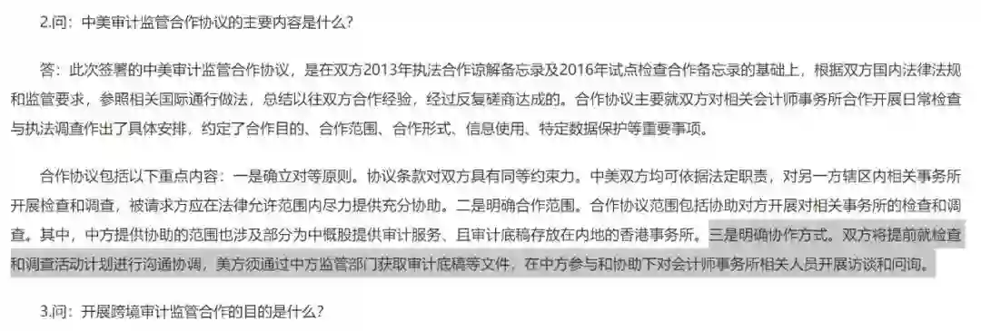 中国证监会表示,合作协议的签署是双方监管机构在解决审计监管合作这一共同关切问题上迈出的重要一步,为下一阶段双方积极、专业、务实推进合作奠定了基础,协议将使投资者、公司和两国都受益。