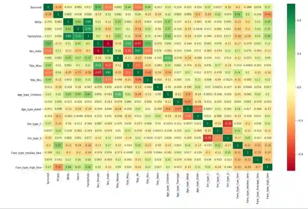相关值接近 1 意味着高度正相关,-1 意味着高度负相关。例如,性别为男和性别为女之间就呈负相关,因为必须将乘客识别为一种性别(或另一种)。此外,你还可以看到,除了用特征工程创建的内容外,没有哪两种是高度相关的。这证明我们做得对。