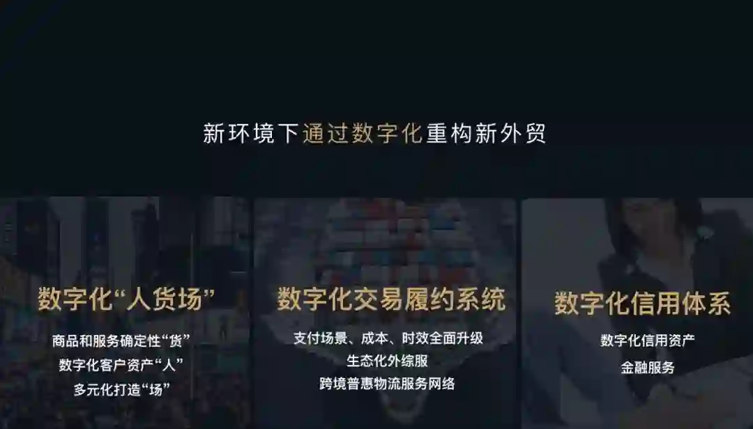 在这里,我解释一下阿里巴巴新外贸操作系统。过去的20年,在阿里巴巴经济体内部,购物、娱乐、本地生活服务等多元商业场景及其形成的数字化能力,与云计算等其他服务充分融合,已经沉淀出一个独特的阿里巴巴新外贸操作系统。这是阿里赋能商业社会的最新承诺,以此构建出一套以“数字化人货场”为内环、“数字化交易履约”为外环、“数字化信用资产”为链接纽带的三大全新矩阵布局。