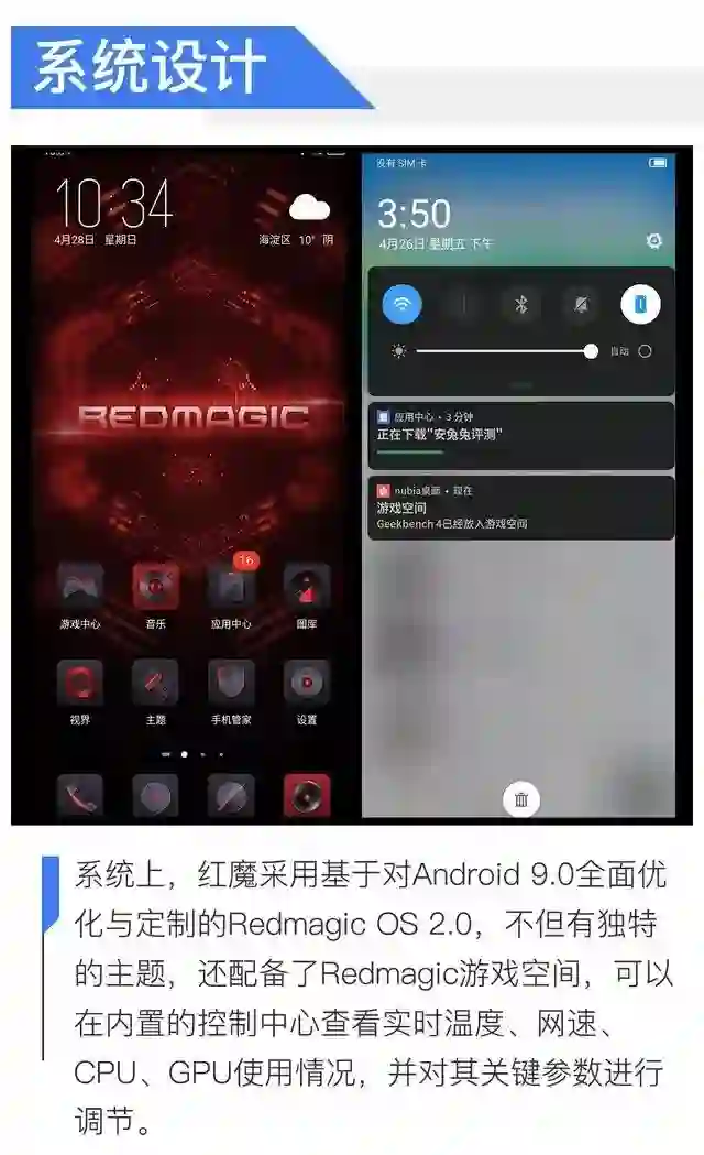 红魔还拥有一键开启的REDMAGIC游戏空间,大部分硬件参数,包括风扇开关都能自定义控制。