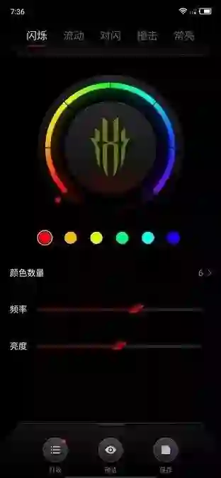 在灯效编辑器2.0中,我们可以看到灯效拥有闪烁、流动、对闪、撞击、常亮这5种模式,色彩和亮度也能无级调节下面让我们来演示一下。