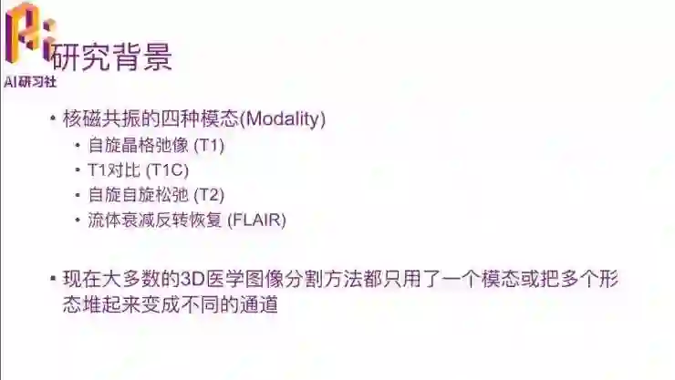 刚才提到多模态的概念,就是因为这个是MRI特有的特征,因为CT里面并没有。这里有四个模态,就是通过四种方式扫描脑部得到MRI数据,这是这里列出来的四个的名字,我们先不用管它这四个具体是什么意思,只是知道它有四种模态就行了,这四种模态对最终切割的结果是有直接的作用的。现在大多数的3D图像切割方法只是用了一个模态,或者把多个模态分别来做,然后再堆积起来。