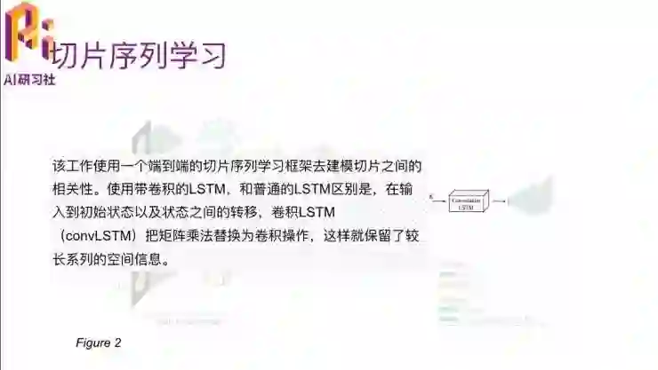 这个convolution LSTM跟普通的LSTM有一个区别,就是把原来的矩阵相乘替换为一个卷积操作,就是普通的乘法变成卷积层,这样它就能够在把之前状态的空间信息保留着。其实它的目的就是,卷积LSTM会描述一个2D切割边缘的趋势,比如说这一张中切片它的形态是这样的,然后到下一张它会有一个轻微的变化,要把这种变化描述出来。