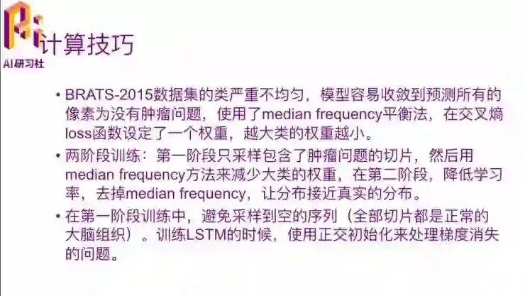 在这个学习过程中使用了two-stage training,第一个阶段是只采用了包含肿瘤的切片,然后用median frequency减少大类的权重。第二阶段是降低学习率,然后把median frequency这种限制去掉,它的分布就是接近你的真实的分布,因为如果使用median frequency,它的分布是会变的,但是真实数据中那个大类的确实会存在,还是要去描述这个问题,先保证了这个模型第一部分不收敛到大类这个问题之后,然后第二个阶段去再去慢慢的学习真实的分布。
