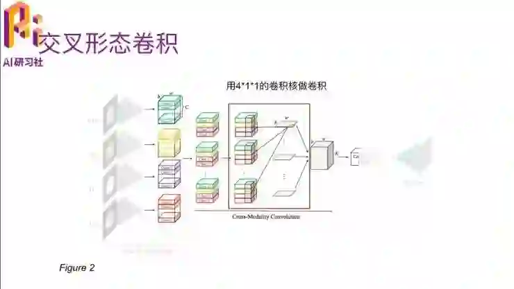 另外一个嗯比较重要的部分就是多模态交叉卷积。四个模态的数据进入到这个卷积网络之后,他就会把每一个模态下面的cross在一起,然后通过一个三维的卷积,卷积的大小里有个C×4,就是因为他每个channel里面有 c 个slice,就是说它是一个立体结构了,一个长宽是H、W,高是C的这种。四个模态弄到一起就是C×4×H×W,有大小。