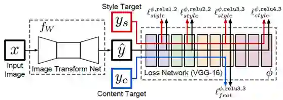 风格迁移网络主要是来自于2016李飞飞等提出感知损失的图像风格迁移与超分辨率论文实现的,网络结构如下: