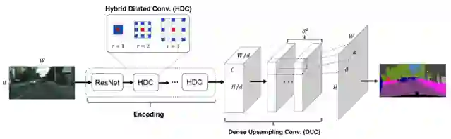 该模型在编码网络中基于残差网络与混合空洞卷积(HDC-Hybrid Dilated Convolution),在解码阶段采用密集上采样卷积(DUC-Dense Upsampling Convolution),最终实现了像素级别的图像语义分割网络。网络模型结构如下: