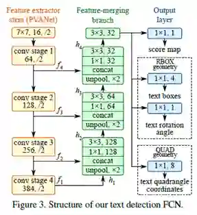 场景文字检测来自2017年旷视科技提出的EAST场景文字检测模型,相关的模型结构如下: