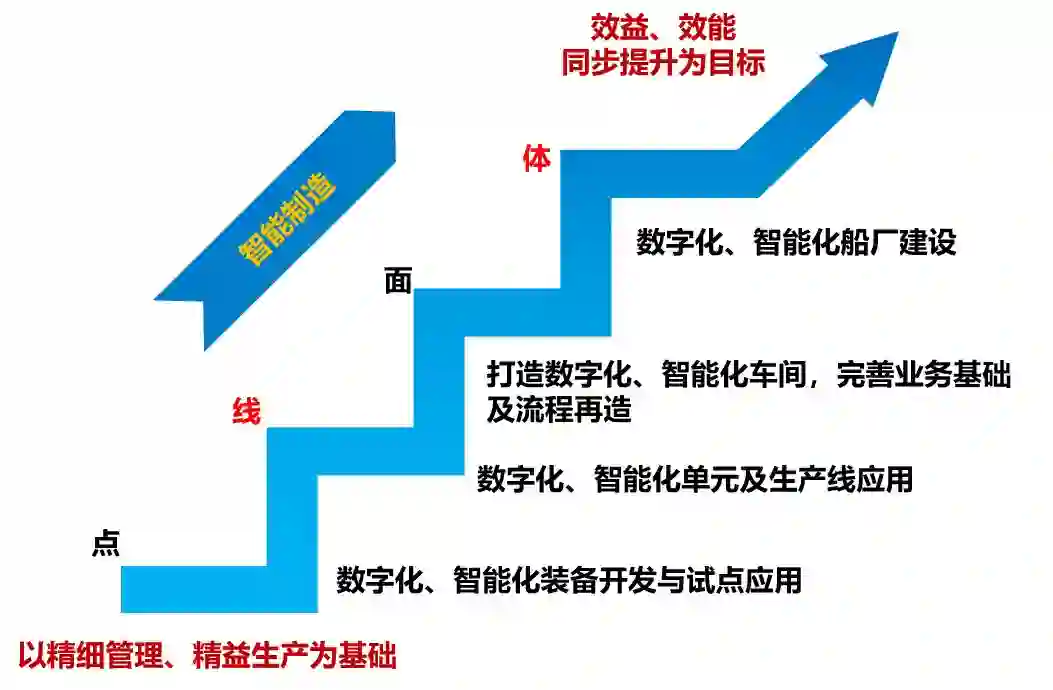 加强顶层规划和设计,深化两化融合,优化流程,推进精益管理和精细化生产,大力推行精益造船,全面提升设计、制造、管理一体化水平。以数字化、网络化、智能化技术深化应用为主线,实现制造过程数字化,以及过程实时智能管控水平,打通物理制造与数字制造空间。按照集团公司要求,通过实施“三步走”战略,到2035年建设成为最具国际竞争力的船舶总装建造智能化企业之一。